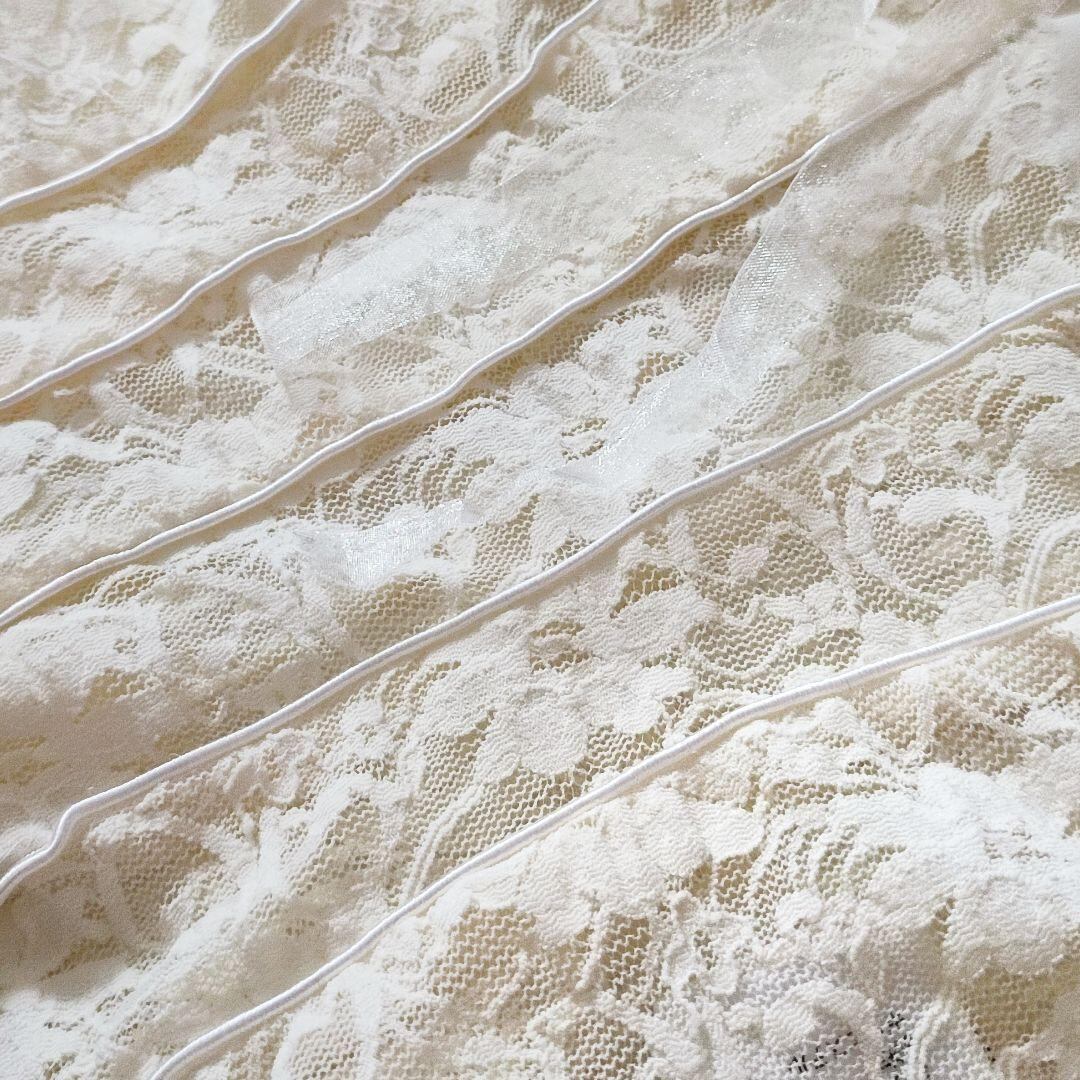 アイボリーのレースタンクトップ、Vネックデザインでエレガントな印象。
